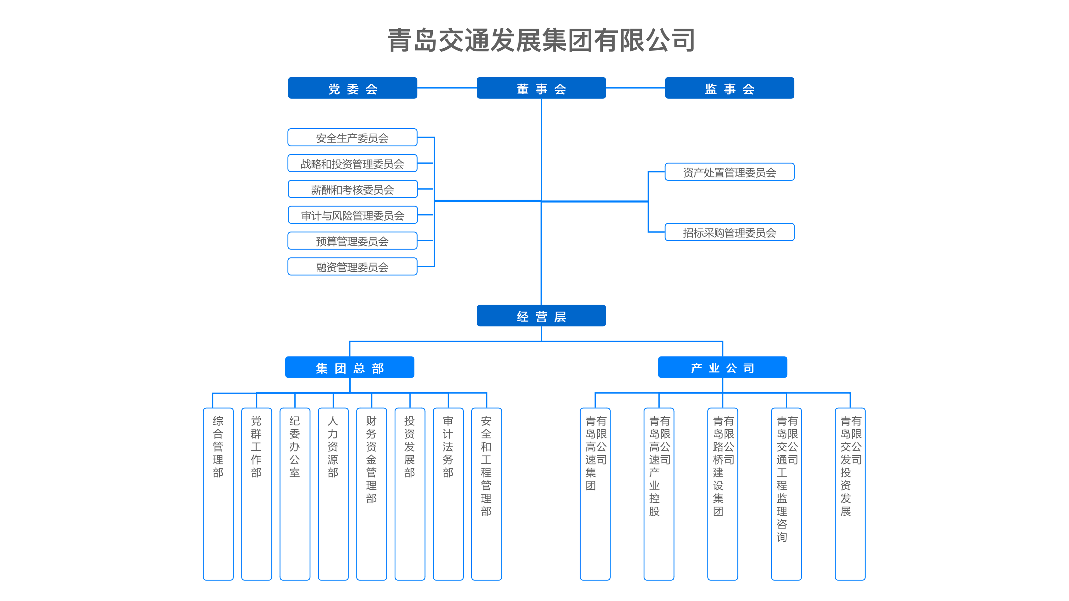 青島交通發(fā)展集團有限公司(以下簡稱“交發(fā)集團”)成立2012年5月,注冊資本10億元,定位為青島市交通建設(shè)投融資主體,負責所轄高速公路等交通基礎(chǔ)設(shè)施的運營、養(yǎng)護、管理工作和投融資建設(shè)任務(wù),承擔青島市未來高速公路發(fā)展和交通基礎(chǔ)設(shè)施建設(shè)投融資等職能?,F(xiàn)有所屬二級企業(yè)18戶,干部職工2100余人。